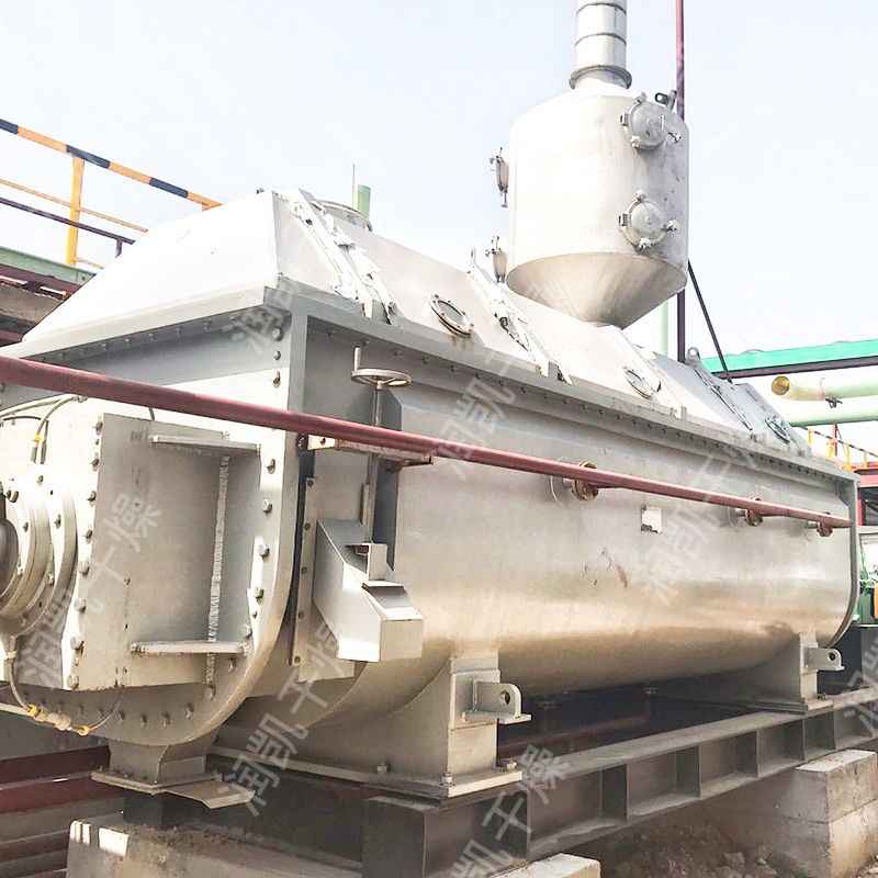 空心軸上密集排列著楔型中空漿葉,熱介質經空心軸流經漿葉。單位有效容積內傳熱面積很大,熱介質溫度從40℃到320℃,可以是水蒸汽,也可以是熱水或導熱油等。傳熱介質通過旋轉接頭,流經殼體夾套及空心攪拌軸,空心攪拌軸依據熱介質的類型而具有不同的內部結構,以保證^佳的傳熱效果。   在漿葉及夾套通入蒸汽加熱的同時,出料口上部同時通入經過加熱后的干空氣進一步干燥,這樣大大增加了設備的干燥強度。蒸發出來的水分由尾氣帶出干燥機,經過布袋除塵器過濾,將干燥后的細粉回收下來,濕空氣由水除塵后引風機排出室外。